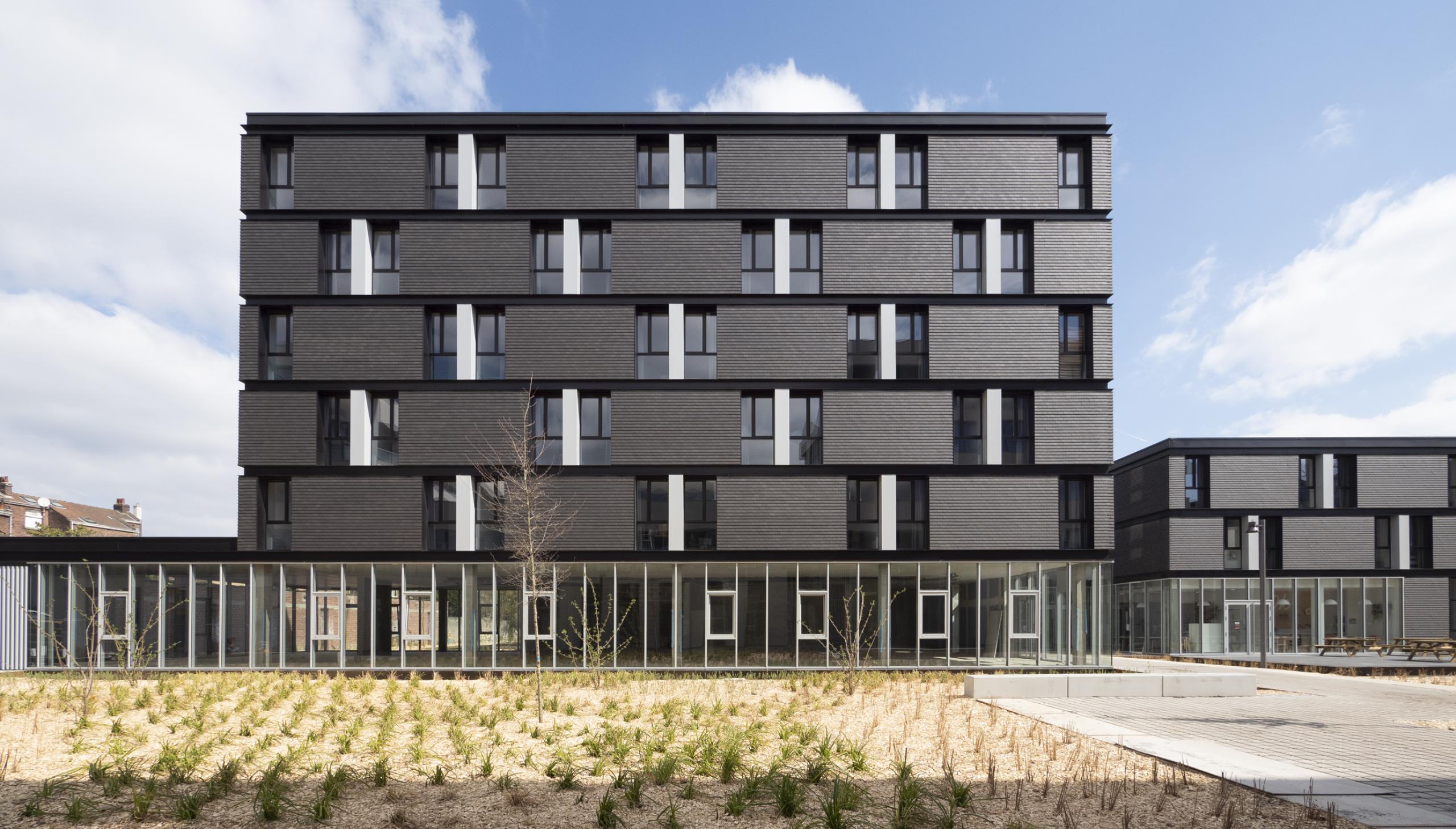 La résidence, le co-working et le local d’activités qui y est associé forment un ensemble de quatre bâtiments de hauteurs variables reliés entre eux par deux espaces vitrés en galeries d’un seul niveau.